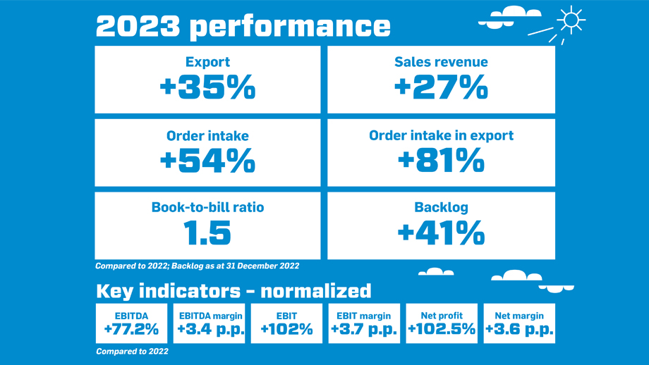 Revenue, profit, and profit margin reached all-time highs, while order intake exceeded EUR 1.3 billion in value. The transformational initiatives and efforts undertaken over the past four years, prioritizing responsiveness to market trends and demands, have paved the way for these outstanding outcomes. The green transition in Europe has been gaining full momentum in recent years, a trend we timely recognized and fully leveraged. Swift adjustments in development, manufacturing, and business operations to align with the new electric power era have led to an unprecedented level of order intake.